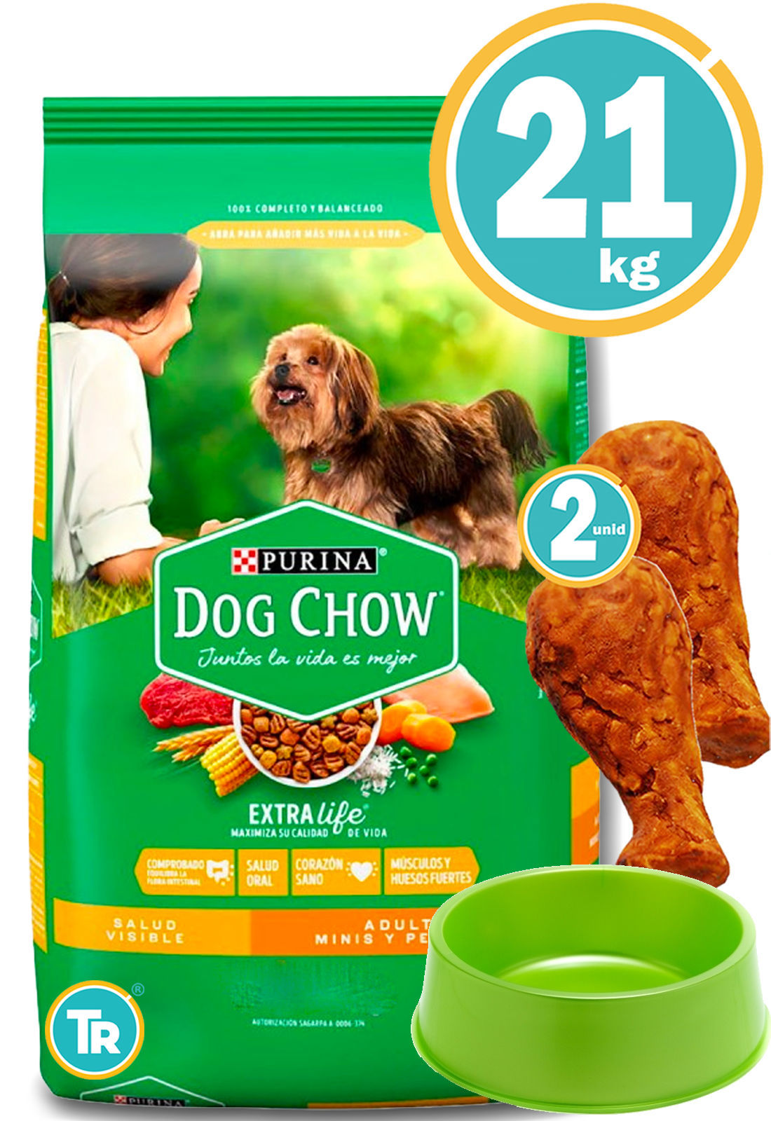 TU RACIÓN PROMOCIÓN DISPONIBLE: DOG CHOW ADULTO Razas Medianas y Grandes 21 kgs + 2 Patas de pollo de lonja digeribles + Comedero de regalo + Envío Gratis