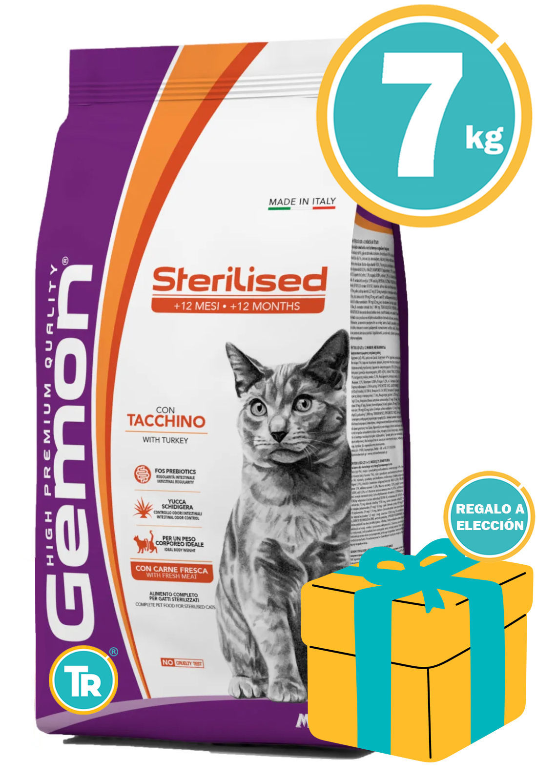 Gemon High Premium Quality es la nueva gama de comida para gatos elaborada con ingredientes de calidad superior para asegurar una dieta diaria saludable para tu amigo esponjoso. Los productos especiales están formulados con elementos superiores que los hacen ricos en proteínas esenciales, vitaminas y sales minerales para la nutrición diaria de su fiel amigo y un crecimiento saludable y equilibrado. Se proporcionan diferentes recetas según la edad y el estilo de vida del animal. GEMON STERILIZED CAT WITH TURQUÍA es un alimento completo para mascotas para gatos adultos esterilizados. La formulación se caracteriza por ingredientes de primera calidad y fuentes de nutrientes esenciales como el pavo, y fuente de carbohidratos, como el arroz, cocidos y altamente digeribles gracias al proceso de extrusión. Una dieta ideal para gatos esterilizados elaborada con fructooligosacáridos (FOS) y mananooligosacáridos (MOS), que son prebióticos para apoyar el bienestar intestinal y con pulpa de remolacha para ayudar a mantener un peso corporal ideal. La receta contiene carne fresca para una palatabilidad óptima y aceite de salmón para mantener el pelaje brillante y suave. También contiene yuca schidigera para limitar los olores intestinales. Sin colorantes ni conservantes artificiales añadidos.