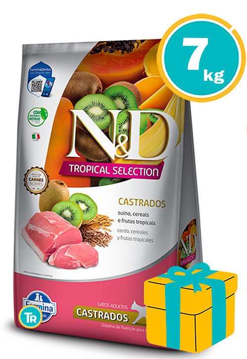 cerdo (carne de cerdo, harina de chicharrón (piel de cerdo) – mín. 5%), cereales y frutas (avena, granos de sorgo, cebada en granos, plátano deshidratado, papaya deshidratada, kiwi deshidratado, mango deshidratado – mín. 35%), harina de vísceras de pollo, grasa de cerdo, huevo en polvo, sub-producto de arroz, sub-producto de trigo, harina de pescado, aceite de pollo, aceite de pescado, pulpa de remolacha, alfalfa deshidratada, celulosa en polvo, levadura seca de cervecería (Saccharomyces cerevisiae), zanahoria deshidratada, aditivos prebióticos (FOS y MOS), DL-metionina, taurina, L-carnitina, sulfato de condroitina, sulfato de glucosamina, aditivos adsorbentes (extracto de yuca (Manihot esculenta) y zeolita), hidrolizado de hígado de aves y cerdos, vitaminas (A, D3, E, B1, B2, B5, B6, B12, C, biotina, niacina, ácido fólico, cloruro de colina), cloruro de sodio, cloruro de potasio, cloruro de amonio, hierro aminoácido quelato, cobre aminoácido quelato, zinc aminoácido quelato, manganeso aminoácido quelato, proteinato de selenio, yodato de calcio, propionato de calcio, concentrado de tocoferoles.