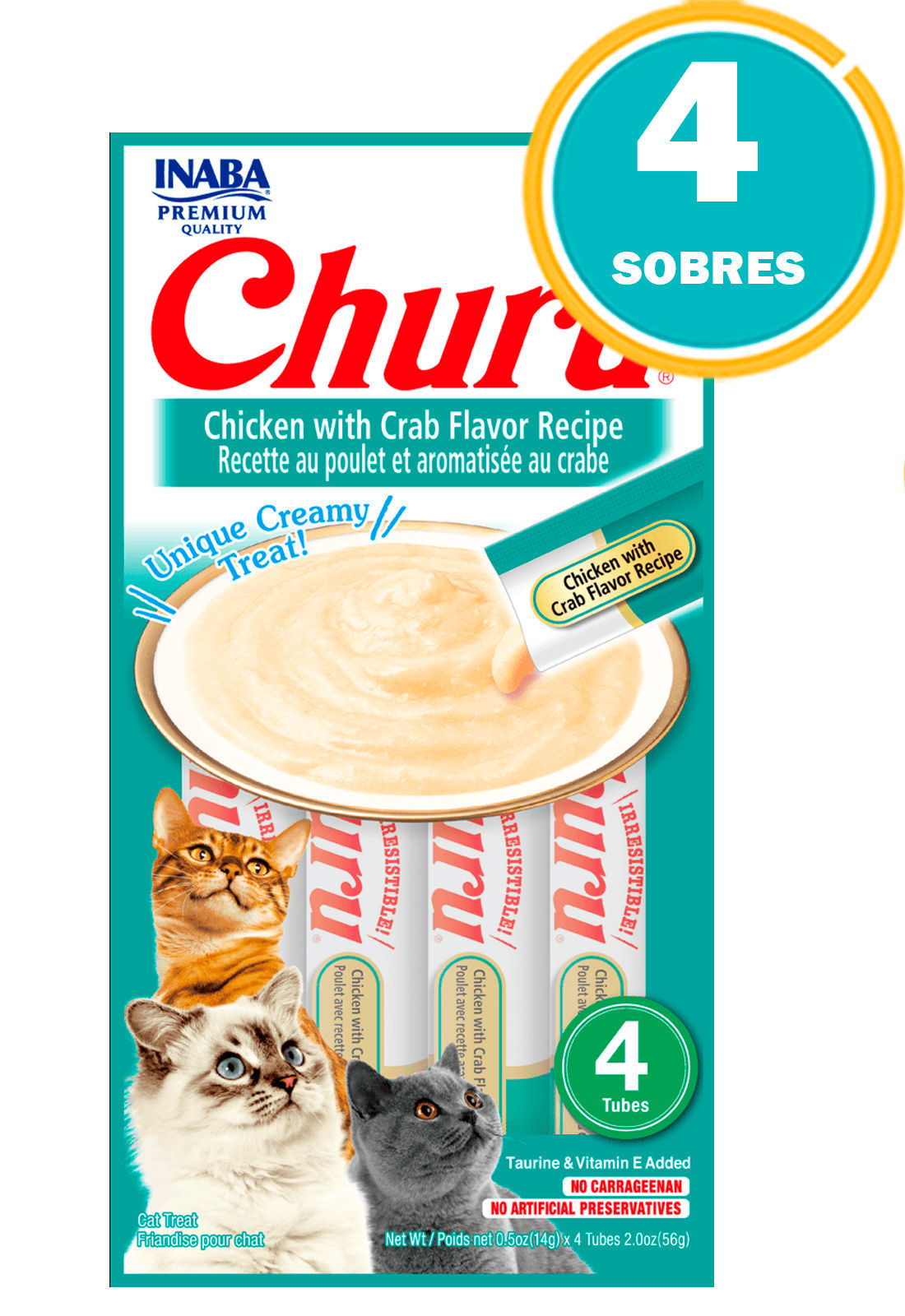 Churu - Snack para gatos de Inaba, 4 unidades de Pollo con Cangrejo. Preparados con pollo proveniente de granjas de confianza. Libre de cereales, conservantes y colorantes artificiales para garantizar la pureza. Su textura cremosa y sabores irresistibles son adorados por los gatos. Perfectos para ser administrados con medicamentos. Con un elevado contenido de humedad esencial para la salud general de los felinos, estos snacks son bajos en calorías, cuidando la dieta de tu gato. Diseñados para ser alimentados con la mano, ofrecen una manera innovadora e interactiva de compartir momentos especiales con tu mascota. Descubre este delicioso y saludable Churu de Inaba, una experiencia única para ambos.
