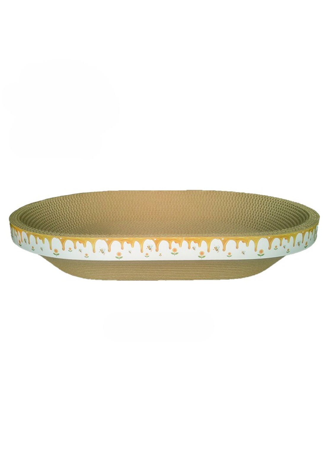 Rascador con diseño ovalado que combina superficie para afilar uñas con zona de descanso. Ideal para satisfacer el instinto natural de rascado mientras brinda un espacio cómodo donde el gato puede relajarse.