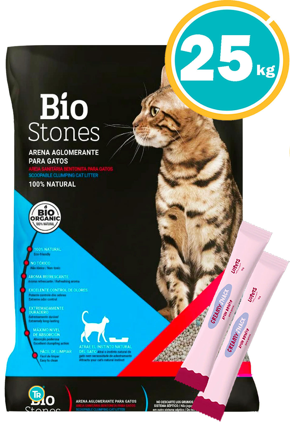 Sanitario Aglomerante Bentonita Bio Stones 25kg + Snack Creamy