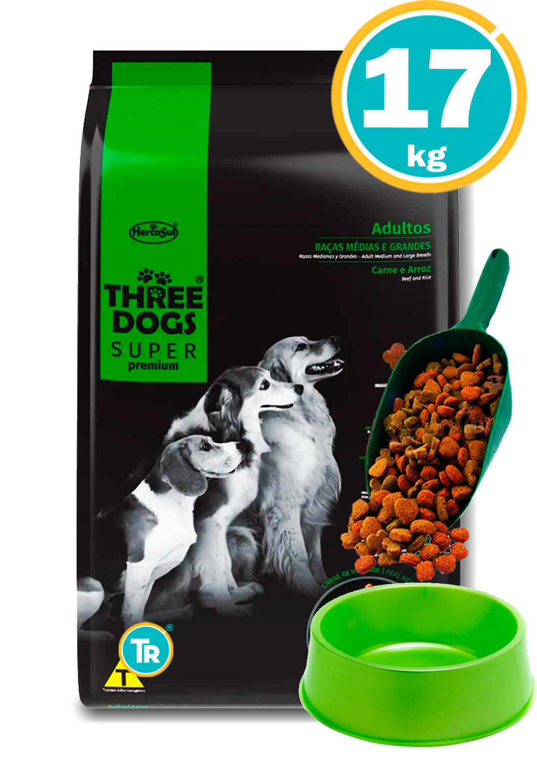 Three Dogs Súper Premium Adultos de Razas Medianas y Grandes – Carne y Arroz - Es un alimento rico en ingredientes de alta calidad que suministran todos los nutrientes necesarios para mantener la calidad de vida y longevidad de los perros. Desarrollado especialmente para las razas Medianas y Grandes, Three Dogs Súper Premium posee en su formulación carne fresca bovina, es fácil de digerir y muy sabroso.