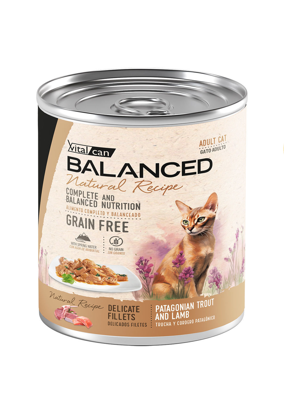 Carne de trucha, agua de manantial, carne de cordero, aceite de pescado, pulpa de remolacha, taurina, sal, lisina, cloruro de potasio, metionina, levadura, carragenina, goma guar, tripolifosfato de sodio. Vitaminas: A, D3, E, K, B1, B2, ácido pantoténico, ácido nicotínico, B6, ácido fólico, biotina, B12, colina. Minerales: hierro, zinc, manganeso, cobre, yodo, selenio.