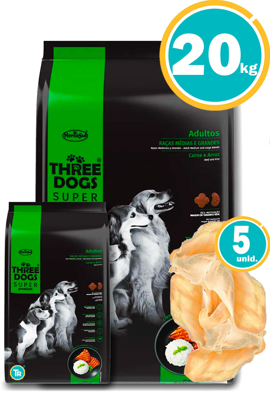 ThreeDogs Super Premium Perro Adulto 20Kg (17+3 KG Fracc) + Orejas + Envío
